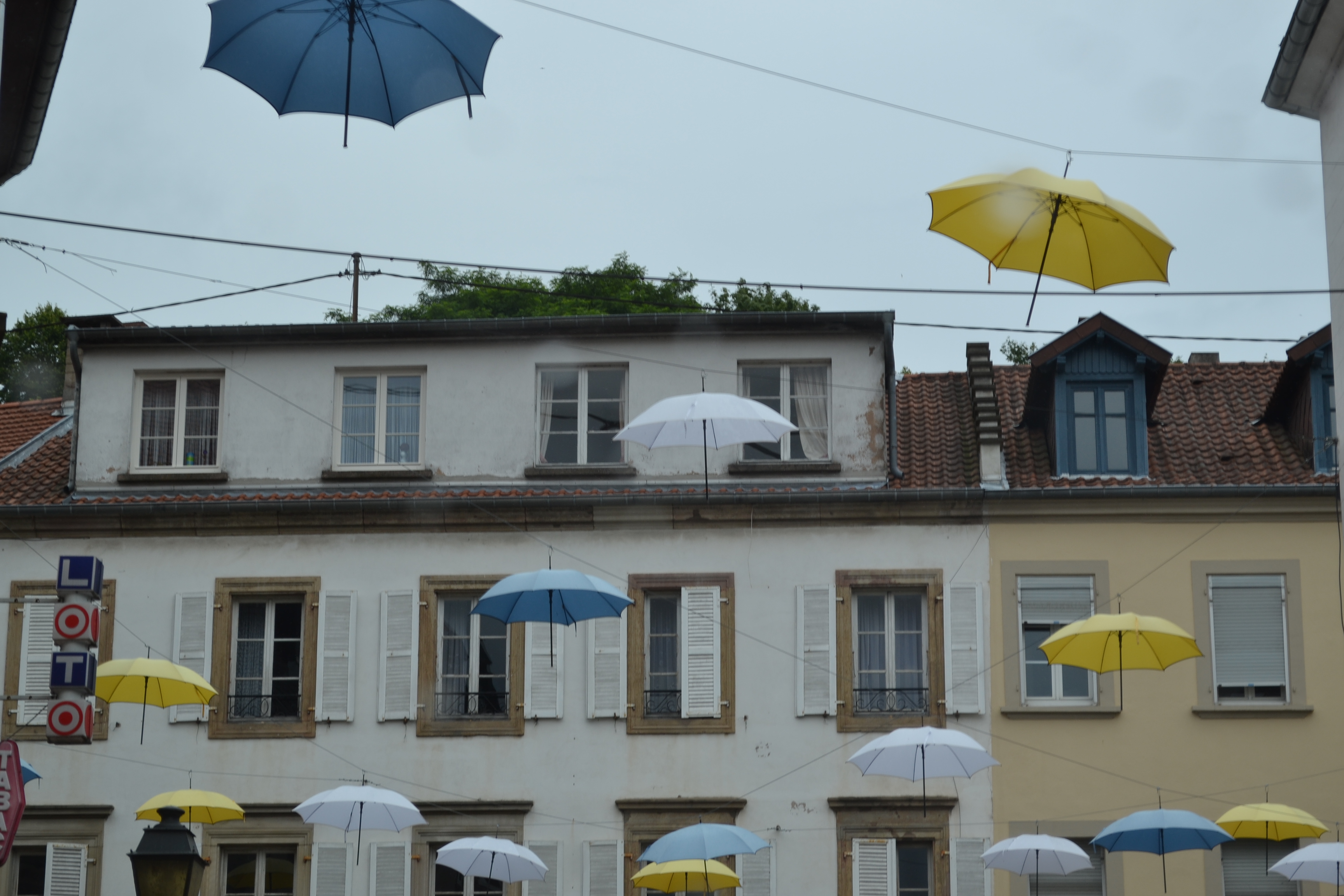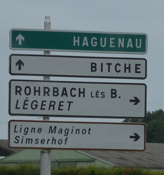 It’s a somber subject, but a fascinating place to visit. Simserfhof is located in Northeastern France, near Bitche (yes, Bitche) just over the border with Germany. Bitche offers it’s own sights to see–most notably its citadel on a hill. It was too rainy for us to tour the Citadel yesterday, but we drove through the town on our meandering way back home, and were delighted to see the following art above one of the town’s squares. A little levity was just what we needed as we left the Maginot Line and planned our own attack on the pastry counter of the Cora Market.