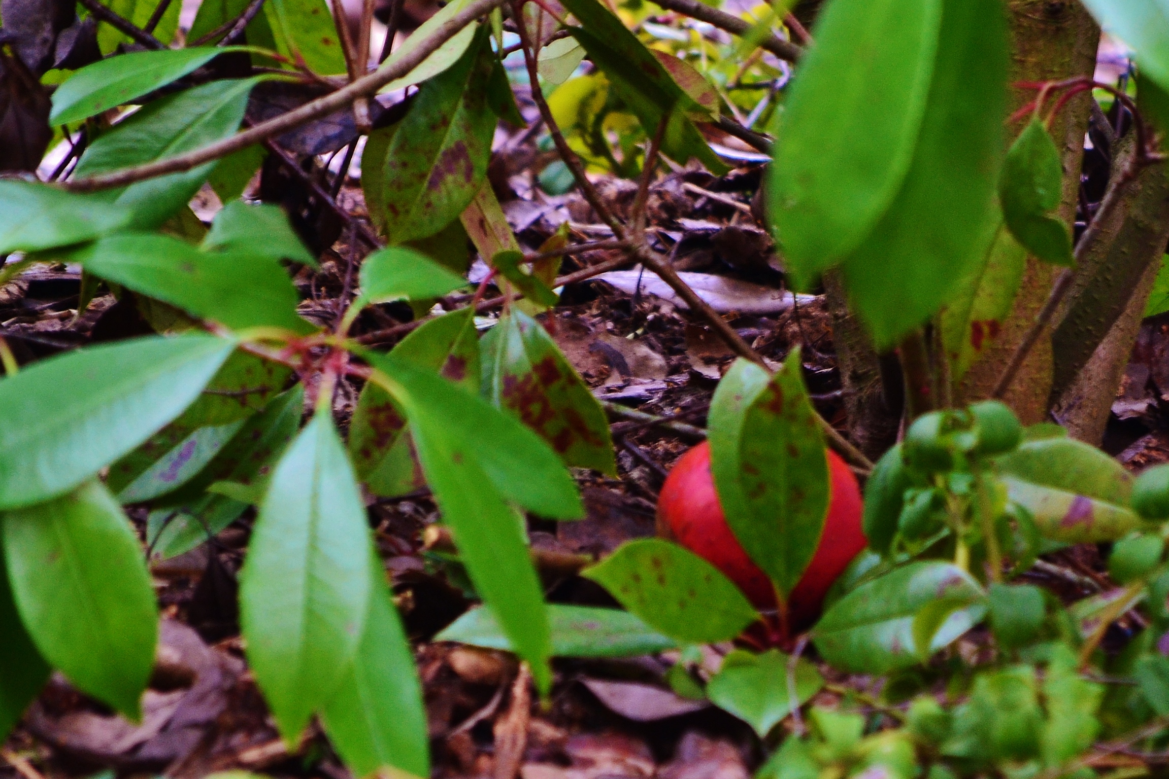 I walked out the front door of my house and saw the apple there–red and vibrant among the few green leaves that still cling to the frozen branches of those front bushes. A bright spot of color in the largely barren tones of winter, it was a welcome sight.
