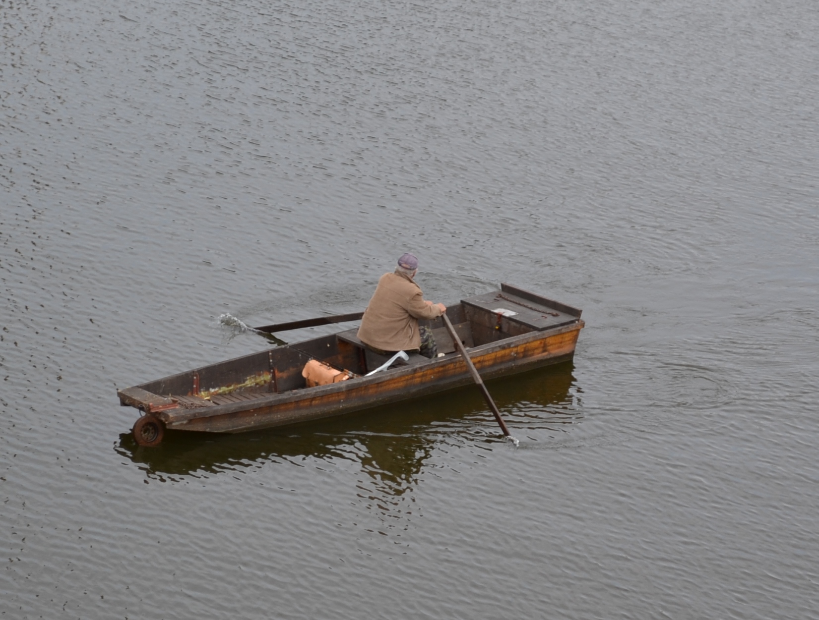 Once he was close to me, I realized that this was a very elderly man, rowing his solitary boat down the long river ever so slowly. He was dressed for more than that slight chill of the morning, in a heavy jacket and old camouflage pants, and he sat with his back to his travel bag and crutch in a rustic wooden boat.