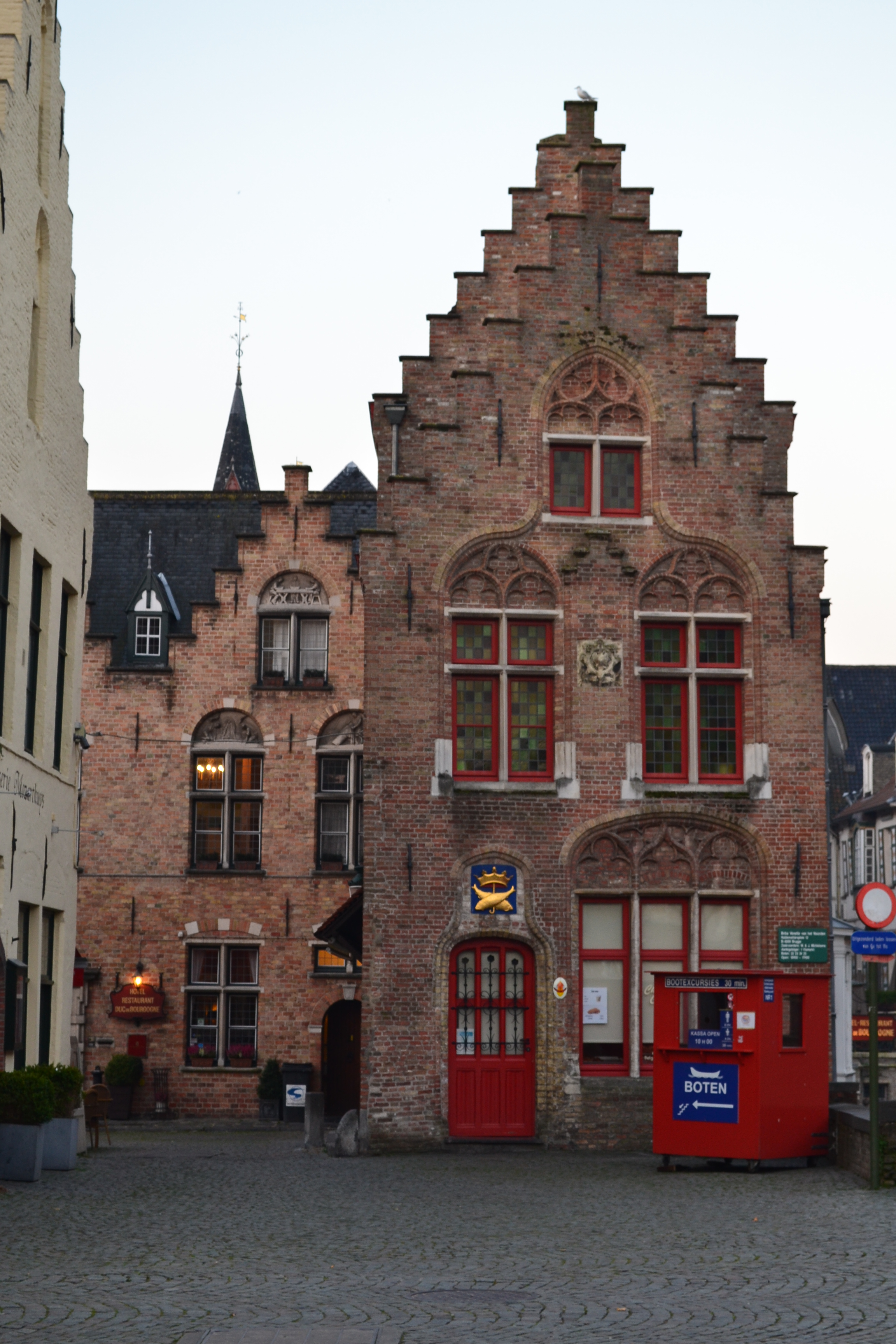 heart of Bruges. It dates back to the 17th century and was the home of the scientist Anselmus Boetius De Bood. It was quaint and comfortable, and the owners were lovely people. Our room was a couple of flights up—a large space that could fit our whole family—the ceiling was crisscrossed by exposed beams and the stairs up to the room were astonishingly narrow. Outrageously narrow. (Not in width of the staircase, but each step was only about 3 inches deep, requiring a funny side step or tiptoe technique to navigate.) Anselmus must have kept magical medieval elves as his servants and housed them in this attic, because no human foot could fit on these stairs. If this had been the Holiday Inn, I’d call these stairs treacherous. But it wasn’t. It was Anselmus Hotel in the Old Town of Bruges, which somehow changes things. This staircase was charming. Or maybe it was a sobriety test, a reminder that this was a respectable hotel—can’t stay here unless you have your wits about you. At least, can’t make it all the way to your room unless you have your wits about you.