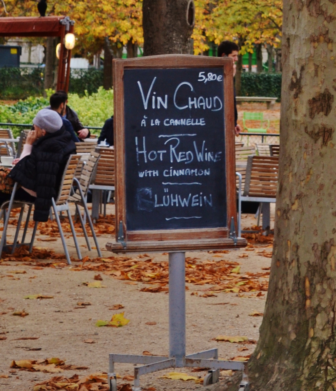 November in les Tuileries has its own vibe– more subdued, but no less wonderful. For the most part, chairs were empty and people strolled rather than sat; leaves fell and the breeze blew lackadaisically; cafes offered up vin chaud (mulled wine); and all was right with the world.
