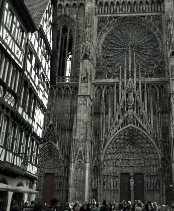 On the border of France and Germany, in the enchanting region of Alsace, sits the ancient town of Strasbourg. She’s the sort of beauty that can bring tears to your eyes– really. The ancient cathedral that pops up like a startled giant as you turn the corner of a tight, wending alley; the rustic half-timbered houses that are painted in cheery colors as a brace against the moody fog of winter mornings in Europe; the myriad small, exquisite restaurants nestled into the tiny crannies of the old town; and the thriving modern art that pulses of youth and energy. This is the town of Strasbourg to me. A fairytale town, both in and out of time– existing somehow as a real, brick and mortar (or wattle and daub) city, but also, so clearly, a space of literal enchantment where you are transported back to a different time, a different world, both fabulous and fierce.
